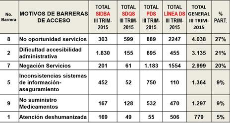 Adicionalmente, la Secretaría Distrital de Salud, ha venido impulsando la puesta en marcha de la primera etapa de implementación de la estrategia de Atención Primaria en Salud que se denominó "Salud a su Hogar". Esta se proyectó inicialmente con el fin de trabajar con enfoque familiar y comunitario, operando con equipos a cargo de intervenciones dirigidas a poblaciones en territorios sociales, comenzando por la identificación de problemáticas, con el propósito central de construir respuestas sociales integrales, oportunas y suficientes a las necesidades individuales, familiares, comunitarias y territoriales detectadas. Para lograr un direccionamiento estratégico en salud que responda a las necesidades por ciclo de vida y por núcleo familiar, se integraron equipos asi: * Agente Comunitario * Gestor en salud * Técnico Entornos * Higienista oral familiar * Medico/a familiar * Enfermero-a familiar * Profesional en Psicología- trabajo social * Nutricionista * Profesional en terapias: física u ocupacional * Profesional área social- humanas * Profesional Soporte Operativo * Profesional soporte entornos * Profesional soporte en salud oral Este proceso ha tenido durante su implementación diversos cambios hasta lo que hoy se conoce como "territorio saludable", con la participación de un equipo de respuesta inicial (medico, enfermera, auxiliares de enfermería) y los equipos de respuesta complementaria. BARRERAS DE ACCESO Bogotá ha tenido mejoras sustanciales durante las últimas décadas. Las transformaciones positivas se han dado en la cultura de los ciudadanos, sumado a una inversión sostenida en infraestructura para mejorar el espacio público, la creación de un sistema de transporte masivo (Transmilenio) y la ampliación de la cobertura de servicios públicos y equipamiento, entre otros. No obstante, los problemas estructurales que atañen a buena parte de la población, como la pobreza, la exclusión y las desigualdades en el ingreso —aun cuando han disminuido sus índices— siguen siendo grandes dificultades que seguirán condicionando en términos generales la calidad de vida y salud de los bogotanos. Resaltando: * Cobertura casi universal del aseguramiento en salud, con predominio del régimen contributivo. * Crecimiento en la prevalencia de enfermedades crónicas. * Problemas propios del sector de la salud: fragmentación entre actores y escenarios. * Dificultades en los sistemas de información. * Barreras de carácter cultural, geográfico y administrativo en el acceso a los servicios salud. ( OPS 2009) Hay un acuerdo mundial en la importancia de la APS, su principal problema es llevarla a la práctica. Esta situación ha llevado a debates de lo que es y no es la APS, a la implementación de experiencias muy variadas y a renovaciones que intentan recuperar el tiempo perdido. El abordaje integral y basado en la participación comunitaria resultaba demasiado idealista a los ojos de diversos sectores (Gomez 1991). En Colombia, ha sido difícil la adecuación de la APS a las condiciones de un sistema de aseguramiento con múltiples administradores y prestadores, por este motivo la OPS ha realizado un diagnóstico de los retos en la implementación de RISS y APS que se adapta a la realidad de Colombia y Bogotá. Los principales son: * Segmentación institucional del sistema de salud. * Descentralización de los servicios de salud que fragmenta los niveles de atención. * Predominio de programas focalizados en enfermedades, riesgos y poblaciones * específicos (programas verticales) que no están integrados al sistema de salud * Separación extrema de los servicios de salud pública de los servicios de atención. * Modelo de atención centrado en la enfermedad. * Debilidad de la capacidad rectora de la autoridad sanitaria. * Problemas en la cantidad, calidad y distribución de los recursos. * Deficiencias en la definición de roles, nivel de competencias. * Multiplicidad de instituciones pagadoras y de mecanismos de pago de servicios; * Conductas de la población y de los proveedores de servicios contrarias a la integración. * Trabas jurídicas y administrativas (OPS 2010) La secretaria de salud de Bogotá en su rendición de cuentas del 2012 resalta barreras de acceso de toda índole con negación del territorio y del servicio, segmentación y fragmentación entre actores e ineficiencia en el manejo de recursos de la salud; Señala que es predominante el modelo asistencialista centrado en la atención de la enfermedad con nula resolutividad,y sin participación de la ciudadanía en decisiones de fondo aunado a la precarización del trabajo. Señala que existen ademas factores que coadyuvan a configurar esta situación como el deterioro del ambiente, los modos de vida de los distintos grupos poblacionales, la inseguridad y las difíciles condiciones de movilidad en la ciudad. (secretaria salud Bogotá 2012) Tabla 1. Principales barreras de acceso a salud.