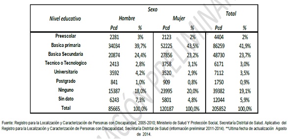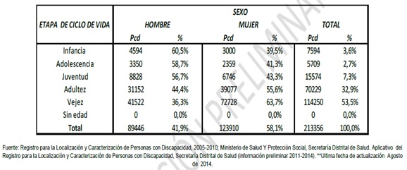 Según la información del Registro para la Localización y Caracterización de Personas con Discapacidad en el D.C, que administra la Secretaría Distrital de Salud, con corte a 30 de Junio de 2014, Bogotá cuenta con 213.356 Personas con Discapacidad, cuya condición está calificada y caracterizada asì: