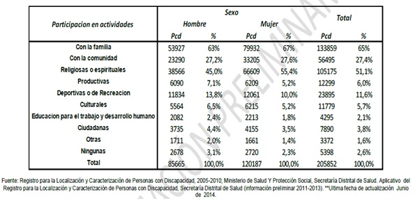 Población con Discapacidad, según participación en actividades y sexo; Bogotá, D.C.; 2004 – 2013