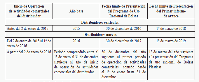 Parágrafo. La fecha límite de presentación de los informes anuales de avance siguientes al primer informe, será el 1° de marzo de cada año. Artículo 7°. Competencia. Las autoridades ambientales competentes para el seguimiento de las metas establecidas en el Programa de Uso Racional de Bolsas Plásticas son: a). Autoridades ambientales regionales y urbanas cuando los distribuidores de bolsas plásticas tengan una cobertura comercial exclusiva en la jurisdicción de dichas autoridades. b). La Autoridad Nacional de Licencias Ambientales (ANLA) en caso de que los distribuidores de bolsas plásticas cuenten con sucursales en la jurisdicción de dos o más autoridades ambientales. CAPÍTULO. III Obligaciones, indicadores y metas Artículo 8°. Obligaciones de los distribuidores de bolsas plásticas. En el marco del Programa de Uso Racional de Bolsas Plásticas, son obligaciones de los distribuidores las siguientes: 1. Formular, presentar, implementar y mantener actualizado el Programa de Uso Racional de Bolsas Plásticas, para el seguimiento de las metas. 2. Presentar el informe anual de avance del Programa de Uso Racional de Bolsas Plásticas, conforme a lo establecido en este acto administrativo. 3. En las bolsas plásticas, incorporar información que oriente al consumidor sobre su uso, que incluya como mínimo: a). Un mensaje ambiental relacionado con el uso racional de bolsas en un tamaño mínimo del 10% del área de una de sus caras. b). La capacidad de carga de la bolsa expresada en kilogramos de forma visible. c). El calibre de la bolsa expresado en milésimas de pulgada o en micras4. d). Recomendaciones para la reutilización de la bolsa. 4. Dar cumplimiento a las metas establecidas. Artículo 9°. Indicadores. Modificado por el art. 2, Resolución 2184 de 2019 <El nuevo texto es el siguiente> El Programa de Uso Racional de Bolsas Plásticas debe incorporar y reportar como mínimo los siguientes indicadores: