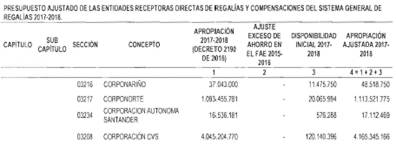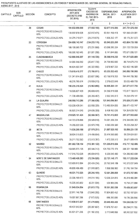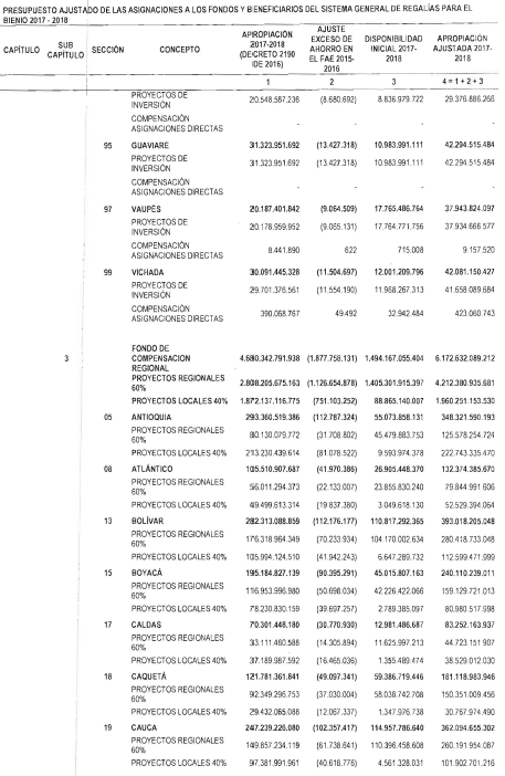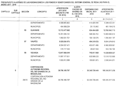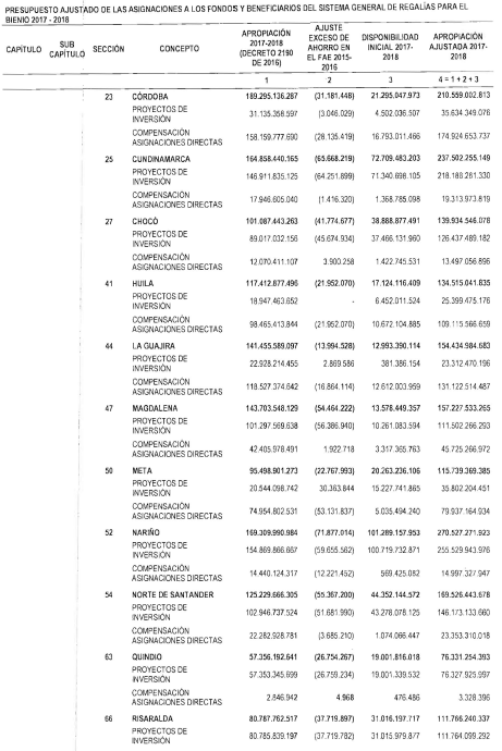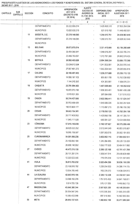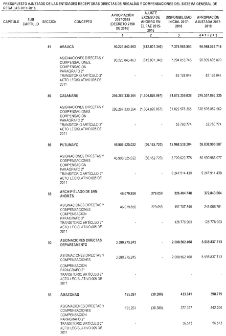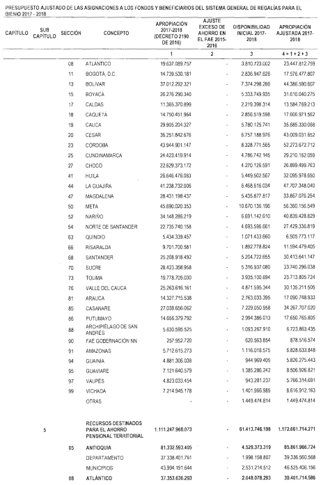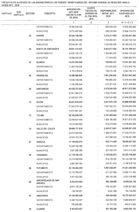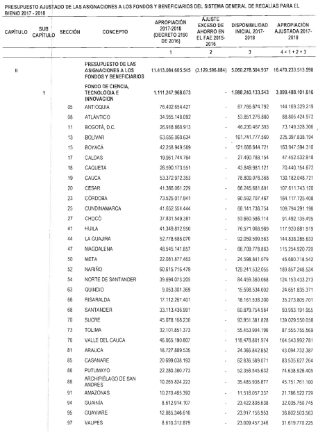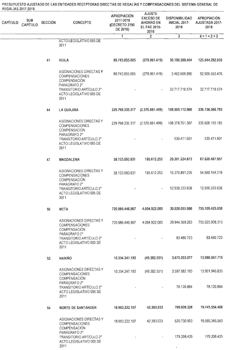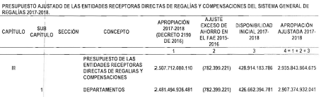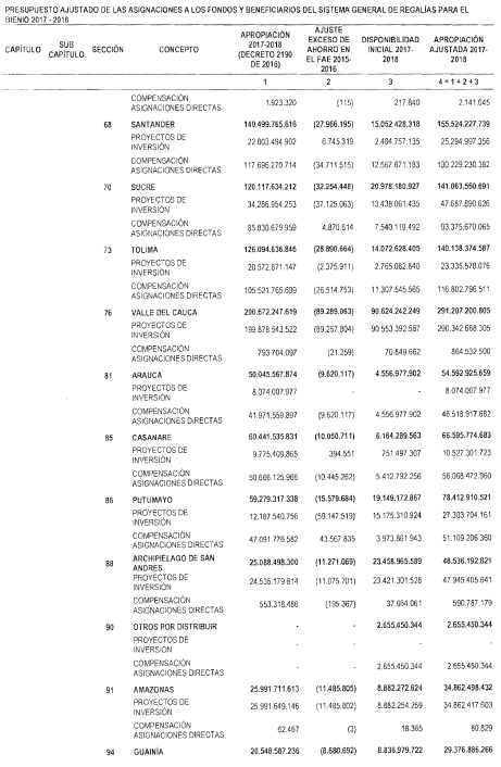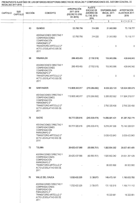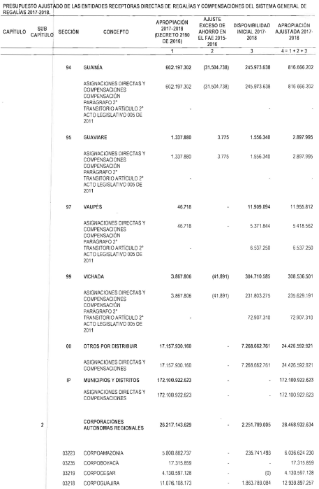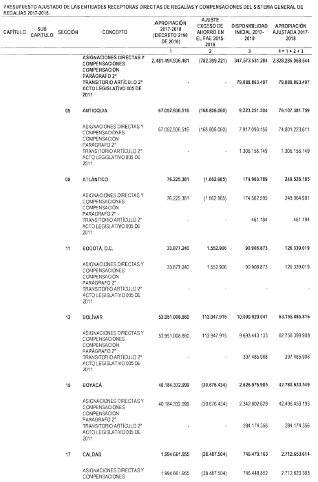"Artículo 11. Presupuesto ajustado de las Entidades Receptoras Directas de Regalías y Compensaciones del Sistema General de Regalías 2017-2018. De conformidad con el monto del Sistema General de Regalías definido en el artículo 80 del presente Decreto, el presupuesto ajustado de gastos a las entidades receptoras directas de regalías y compensaciones del Sistema General de Regalías durante el bienio del 1o de enero de 2017 al 31 de diciembre de 2018, asciende a la suma de DOS BILLONES NOVECIENTOS TREINTA Y CINCO MIL OCHOCIENTOS CUARENTA Y TRES MILLONES OCHOCIENTOS SESENTA Y CUATRO MIL SEISCIENTOS SETENTA Y CINCO PESOS MONEDA LEGAL ($2.935.843.864.675), de acuerdo con el siguiente detalle: