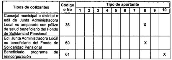 11. En el numeral 4 “RELACIÓN TIPO DE COTIZANTE VS. TIPO DE APORTANTES” del capítulo 4 “Validación Coherencia Datos” del Anexo Técnico 2 “Aportes a Seguridad Social de Activos”; modificar la “Tabla 9. R04 - Regla de validación - Tipo de cotizante Vs Tipo de aportante”, en el sentido de modificar el tipo de cotizante “36 - Concejal municipal o distrital o Edil de Junta Administradora Local no amparado con póliza de salud beneficiario del Fondo de Solidaridad Pensional” y adicionar las validaciones del tipo de cotizante “60 Edil de Junta Administradora Local” y “61 - Beneficiario programa de reincorporación”; así: