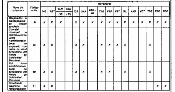 Resultado: Cuando en la información de una planilla reportada por un aportante se presente que el cruce entre tipo de cotizante y el tipo de novedad que puede presentar NO sea “X”, el archivo no debe pasar la malla de validación y el operador de información le debe informar al aportante el error presentado.”