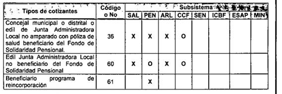 17. En el numeral 10 “RELACIÓN TIPO DE COTIZANTE VS. SUBSISTEMA AL QUE APORTA” del capítulo 4 “Validación Coherencia Datos” del Anexo Técnico 2 “Aportes a Seguridad Social de Activos”; modificar la “Tabla 17. R10 - Regla de validación - Tipo de cotizante Vs Subsistema al que aporta”, en el sentido de modificar el tipo de cotizante “36 - Concejal municipal o distrital o edil de Junta Administradora Local no amparado con póliza de salud beneficiario del Fondo de Solidaridad Pensional” y adicionar las validaciones del tipo de cotizante “60 Edil de Junta Administradora Local” y “61 - Beneficiario programa de reincorporación”; así: