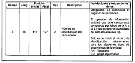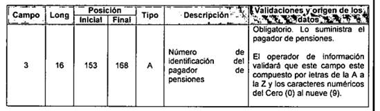 Lo suministra el pagador de pensiones. Solo debe ser reportado cuando se reporte un tipo de pensionado 9 El operador de información validará que este campo esté compuesto por letras de la A a la Z y los caracteres numéricos del cero {0) al nueve (9).