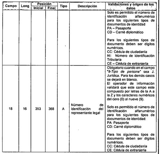 Obligatorio cuando el campo 9 de este archivo este reportado como persona jurídica. El diligenciamiento es opcional para el tipo de persona N - Natural. Lo suministra el aportante. El operador de información validará que este campo este compuesto por letras de la A a la Z y los caracteres numéricos del Cero (0) al nueve (9). Sólo es permitido el número de identificación alfanumérico para los siguientes tipos de documentos de identidad: