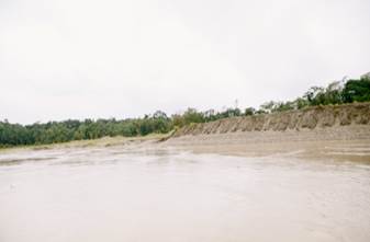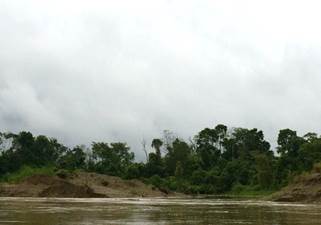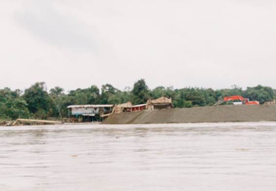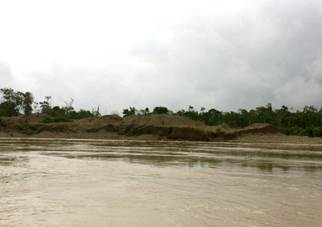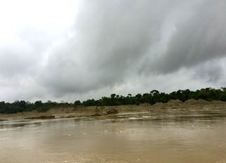 Siendo las 10:52 a.m. se advierte por la Corte y por los miembros de la delegación cómo la capa vegetal (bosque) queda seriamente afectada después de la realización de actividades de minería con dragas, dragones y retroexcavadoras. Se puede apreciar la presencia de maquinaria pesada en el río, residuos de los insumos usados en minería, basura, gran sedimentación y múltiples bancos de arena que ahora ocultan de forma permanente el paisaje selvático. No se sabe a estas alturas cuál es el cauce del río. (Fotografías 75 a 80).