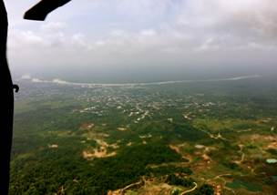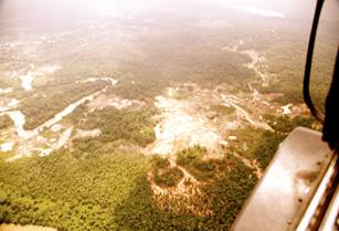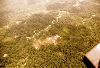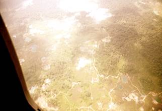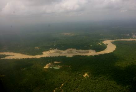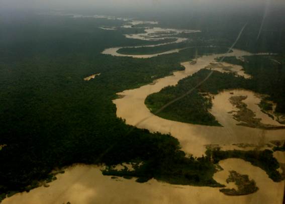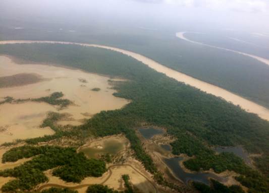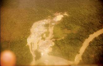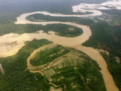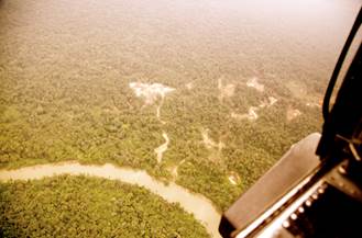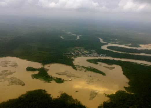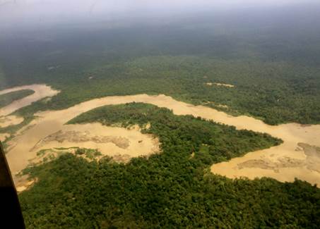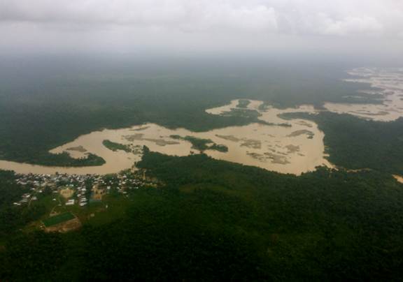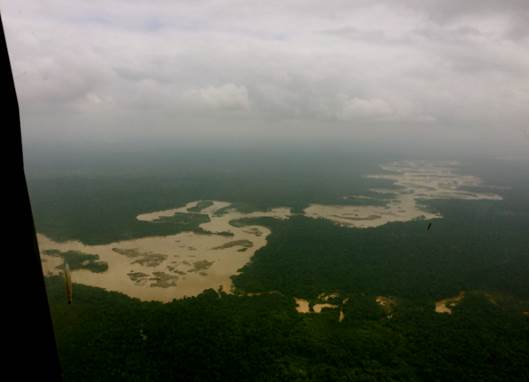 El sobrevuelo -en un helicóptero facilitado por el Ejército Nacional- comienza hacia las 11:45 a.m. y tiene una duración aproximada de 60 minutos. En el sobrevuelo los funcionarios delegados toman fotografías, reciben declaraciones y graban videos de las zonas donde se desarrollan actividades de minería -tanto en el río como en tierra- y explotación forestal.