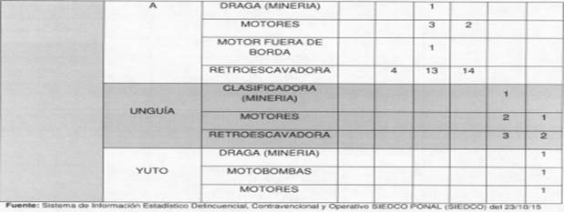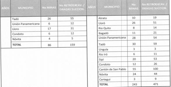 2.3. Indica que los aprovechamientos mineros ilegales que se realizan en el río Atrato, sus afluentes y territorios contiguos, que para 2013 según datos de Codechocó -la autoridad ambiental regional- se estimaron en 200 entables mineros y aproximadamente 54 dragas en operación, se caracterizan por la extracción de metales preciosos, en especial oro y platino, para lo que se emplean distintas modalidades de explotación con maquinaria pesada.