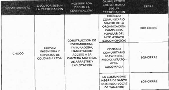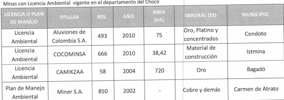 ii). Valerio Andrade, representante de Cocomacia, manifiesta que siempre han querido que la minería que se desarrolle en la región sea hecha por las comunidades y compatible con el medio ambiente. Que con ese propósito han seguido un largo proceso a través de los años para lograr que las autoridades les concedan títulos y concesiones mineras, en particular, las que denominan “áreas especiales de minería para comunidades negras”. Señala que en 2008, después de muchos trabajos y manifestaciones, les entregaron la Resolución 141850 que les permite explotar los minerales de la zona. Que en 2009 solicitaron ante MinMinas títulos de concesión minera y les fue concedido el contrato de concesión 15251. Aclara que lo conseguido ha sido mediante largas luchas y procesos. Explica que la cuenca del río Quito está compuesta por 5 municipios y que muchos municipios como Itsmina, Aguas de Paradó, Cantón de San Pablo, Unión Panamericana, Río Certegí y río Quito están sufriendo las consecuencias de la minería. Dice que la situación se agrava dado que todos los municipios vierten sus aguas al Río Quito. Reitera que quieren hacer minería responsable, pero denuncian que el Estado los ha abandonado y que ese abandono es el causante de la situación tan grave que hoy se presenta en la zona debido a la minería sin control. Exige que el daño causado por la minería sea reparado integralmente a cada uno de los habitantes de la región y sus comunidades. Pone a los presentes por testigos de los graves daños y afectaciones que ha causado la minería en la región. Finalmente, denuncia que al Estado colombiano no le importa lo que ocurra con las comunidades negras, a quienes ha marginado y abandonado.