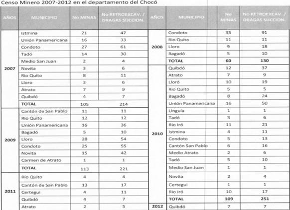 vi). José Dolores Palacios, líder comunitario, señala que el municipio de Río Quito vive hoy una situación muy difícil, cuando en el pasado fue una importante “autopista comercial” que comunicaba Quibdó con la región de San Juan. Afirma que es muy triste transitar hoy por el río Quito (que se está secando) desde Atrato a Paimadó o Manacruz porque la minería no solo ha cambiado el cauce del río sino que ha acabado con el “pancoger” de la gente y con las formas tradicionales de subsistencia basadas en la agricultura y los cultivos de ñame, yuca y plátano. Los árboles ancestrales como el borojó, el chontaduro, el “árbol del pan”, el “pacó” y el plátano ya no se dan y tampoco se pueden transportar debido a la forma en que la explotación minera ha destruido el río. Explica que antes desde Paimadó se llevaban estos productos a Quibdó y que ahora solo es posible conseguir estos alimentos en la capital del departamento. Afirma que no está en contra de la minería pero sí de la forma en la que la están realizando porque acabó con la minería ancestral (ya las señoras no encuentran oro con “la batea, el cacho, la matraca o la pala”) y también arrasó con la tierra cultivable. Y la gente vivía de esas actividades artesanales. Denuncia que ha habido una clara negligencia estatal porque no ha controlado ni vigilado las actividades mineras en el Chocó y porque tampoco ha prestado ayuda a las autoridades locales para que puedan cumplir con sus resoluciones de suspensión de la minería, “que se han quedado en letra muerta”. Cuenta que hace poco 22 dragones fueron incautados y puestos en el malecón de Quibdó pero los mismos fueron reasignados a municipios que no han respondido por su uso o desmantelamiento.