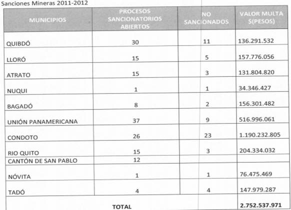 xv). Harry Escobar, representante de Codechocó, señala en primer lugar que la problemática minera es de todo el departamento. Manifiesta que la gestión que viene desarrollando Codechocó, como autoridad ambiental, ha consistido en la realización de operativos contra la actividad minera, y que en consecuencia han impulsado más de 122 procesos sancionatorios contra mineros ilegales, y que de ellos se han fallado aproximadamente 60. Agrega que en 2015 con acompañamiento de la Fuerza Pública se capturaron a 44 personas que estaban realizando actividad minera ilegal. Denuncia que esta clase de explotación ha sobrepasado la capacidad de respuesta institucional, porque la Corporación no cuenta con los medios ni con los instrumentos para evitar el deterioro del medio ambiente y los recursos naturales. Afirma que la responsabilidad en este caso no es solo de Codechocó sino de las alcaldías municipales, la Gobernación y de los mismos Consejos Comunitarios, que en muchos casos realizan convenios con los mineros ilegales a cambio de un usufructo o de un pago. Anuncia que en Codechocó están desarrollando un plan para el control de la actividad minera, cuyo éxito dependerá de la efectiva participación de todos los actores involucrados en la problemática. Finalmente señala que espera que la Corte tome medidas que le permitan a la Corporación hacer un trabajo más efectivo contra la minería.