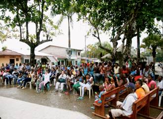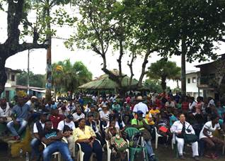 Sobre las 11:40 a.m., los funcionarios y la delegación que los acompaña arriban a Paimadó, cabecera municipal de Río Quito (Chocó), donde se realiza visita a la zona y se escucha a los accionantes y a las comunidades reunidas en asamblea para este fin (aproximadamente 250 personas). El orden de intervenciones es el siguiente[354]: