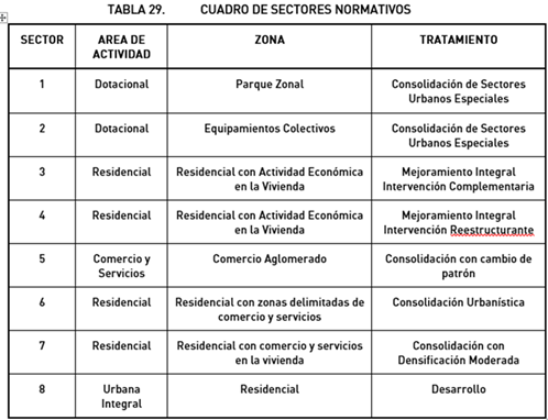 El numeral 6.2 tiene el cuadro de sectores normativos y una breve reseña sobre la definición de usos y tratamientos en la cual se señala lo siguiente: “La definición de Usos y Tratamientos establecida en la cartografía oficial del Decreto 190 de 2004, fue ajustada a las condiciones reales de la UPZ de acuerdo con los criterios técnicos como los niveles de consolidación y las condiciones urbanísticas actuales como el ancho de las vías y la presencia o no de las zonas verdes definidas en los planos de legalización de los diferentes desarrollos. Dichos cambios se realizan bajo el artículo 50 de Decreto 190 de 2004. (…)”