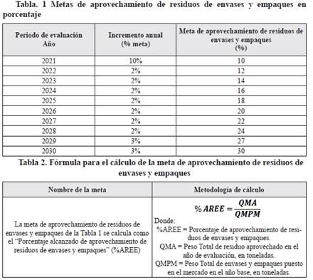 a) Metas cuantitativas: Los productores deberán cumplir la meta de aprovechamiento de residuos de envases y empaques con respecto al peso total de envases y empaques puestos por ellos en el mercado en el año base, en los porcentajes establecidos en Tabla 1 de la presente resolución