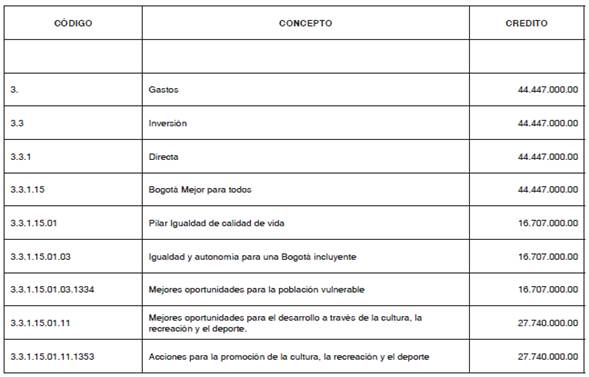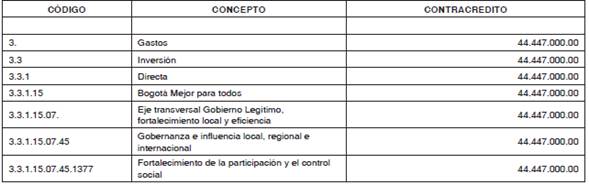 Que es necesario disminuir el siguiente rubro: 3.3.1.15.07.45.1377 Fortalecimiento de la participación y el control social por valor de CUARENTA Y CUATRO MILLONES CUATROCIENTOS CUARENTA Y SIETE MIL PESOS ($44.447.000,00) y aumentar los siguientes rubros: 3.3.1.15.01.11.1353 Acciones para la promoción de la cultura, la recreación y el deporte por valor de VEINTI SIETE (SIC) MILLONES SETECIENTOS CUARENTA MIL PESOS ($27.740.000.00); y 3.3.1.15.01.03.1334 Mejores oportunidades para la población vulnerable por valor de DIECISÉIS MILLONES SETECIENTOS SIETE MIL PESOS ($16.707.000,00).