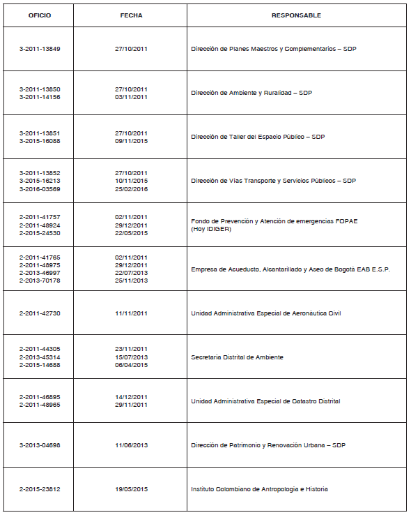 Que con el fin de verificar el cumplimiento de las normas urbanísticas tenidas en cuenta para la formulación ajustada del plan parcial “El Chanco” y pronunciarse sobre su viabilidad, la Dirección de Planes Parciales solicitó conceptos técnicos a las entidades y dependencias que se habían pronunciado con antelación y que presentaron observaciones tal como consta en los oficios que se relacionan a continuación: