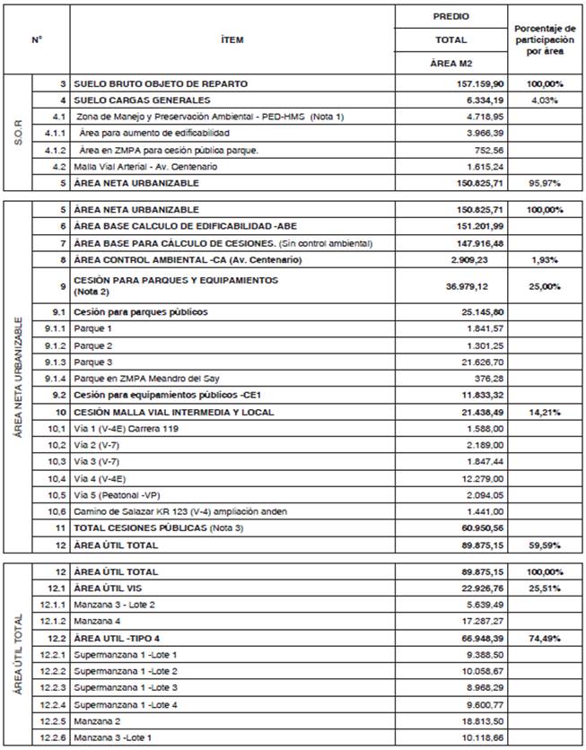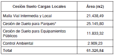 *La cesión para parques incluye el área válida como parque en ZMPA en una proporción 1 a 2 de acuerdo al literal d del artículo 13 del Decreto Distrital 327 de 2004.