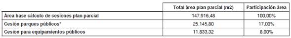 Para tal efecto, el aprovechamiento urbanístico adicional en el plan parcial “El Chanco” establece cesiones adicionales de suelo correspondientes a 27.959,67 m2, conforme se muestra en la siguiente tabla: