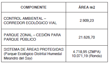 *Del total del área de la ZMPA del Parque Ecológico Distrital - Humedal Meandro del Say (4.718,95 m2); 3.966,39 m2 se contabilizan como carga general a cambio de mayor edificabilidad, y los restantes 752,56 m2, hacen parte de las cargas locales.