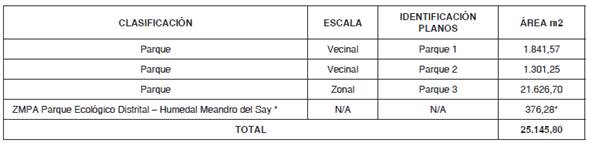 Nota 1. Del total del área de la ZMPA del parque ecológico distrital - Humedal Meandro del Say (4.718,95 m2); 3.966,39 m2 se contabilizan como carga general a cambio de mayor edificabilidad, y los restantes 752,56 m2 hacen parte de las cargas locales.