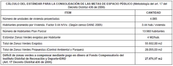 ARTÍCULO 34°. - CUMPLIMIENTO DEL PAGO COMPENSATORIO POR ESTÁNDAR DE ESPACIO PÚBLICO. De acuerdo con lo indicado en el artículo 16 del presente decreto, el estándar de espacio público exigido para el plan parcial es de 55.932,00 m2 destinados a zonas verdes, de los cuales 28.055,03 m2 se encuentran en el ámbito del proyecto, por ende el remanente de 27.876,97 m2 serán pagados al Fondo para el Pago Compensatorio de Cesiones Publica para Parques y Equipamientos a cargo del Instituto Distrital de Recreación y Deporte – IDRD, en los términos de que trata el artículo 10 del Decreto Distrital 323 de 2004.