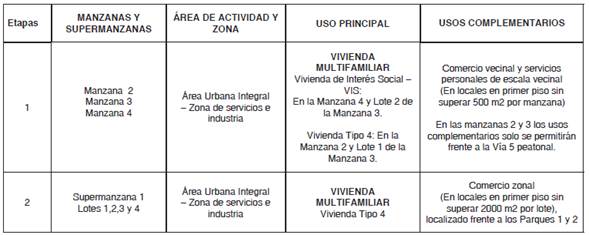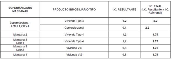 Nota. El área destinada a los usos complementarios (comercio vecinal manzanas 2, 3 y 4) se entiende incluida dentro de los índices de construcción señalados, por lo cual los índices de construcción indicados en este artículo para la Unidad de Gestión se entienden como finales.
