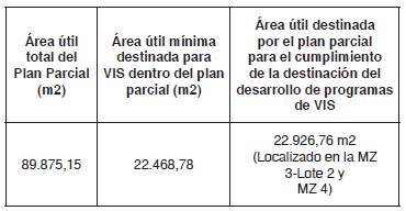 ARTÍCULO 27°. - PORCENTAJE DE SUELO PARA EL DESARROLLO DE VIS. Según lo establecido en el Decreto Nacional 4259 de 2007, norma aplicable al plan parcial “El Chanco” conforme a la Resolución 1284 de 2010 de la Subsecretaría de Planeación Territorial de la SDP, el presente plan parcial destina un área mínima equivalente al 25% del suelo útil para el desarrollo de proyectos de Vivienda de Interés Social (VIS) de la siguiente manera:
