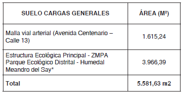 Las cargas generales que se localizan en el ámbito geográfico del plan parcial corresponden a los elementos de la malla vial arterial y la estructura ecológica principal, que se indican en la siguiente tabla: