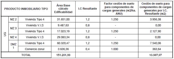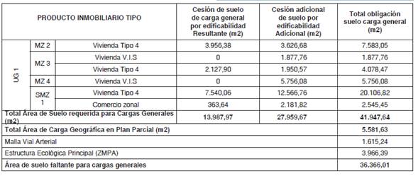 ARTÍCULO 35°. - EDIFICABILIDAD RESULTANTE EN EL PLAN PARCIAL Y CARGAS GENERALES. La edificabilidad resultante asociada a los productos inmobiliarios que se desarrollarán en la única unidad de gestión, garantiza el aporte de la cesión de suelo para componentes de carga general según lo establecido en el artículo 20 del Decreto Distrital 436 de 2006. En este sentido, la cesión de suelo para componentes de carga general por índice de construcción resultante en el plan parcial “El Chanco” es de 13.987,97 m2 conforme se muestra en la siguiente tabla: