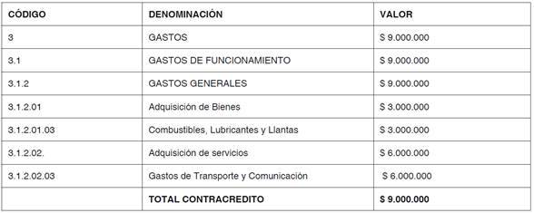 ARTÍCULO 1. Efectúense unos contracreditos en el presupuesto de Gastos de Funcionamiento del Fondo de Desarrollo Local de Bosa, por valor de nueve millones de pesos m/cte ($9.000.000.), conforme al siguiente detalle: