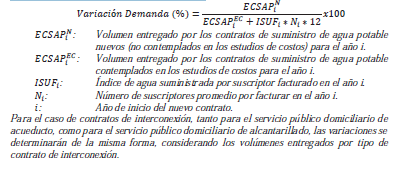 Para los contratos de suministro de agua potable, las variaciones en la demanda se determinarán para el primer año completo del nuevo contrato, calculando la relación entre el volumen proyectado de los contratos de suministro de agua potable no contemplados en los estudios de costos y la demanda estimada en el estudio de costos vigente para el año de cálculo, de acuerdo con la siguiente expresión: