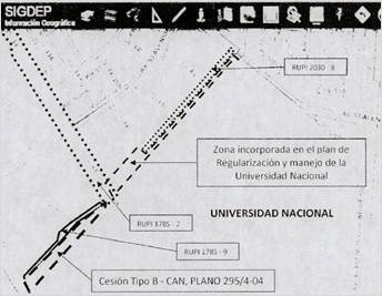 En el plano urbanístico 295/4-04 adoptado por la Resolución 03 de 1989 se indica que una parte de la franja, de la cual la Universidad Nacional de Colombia alega ser propietaria en la solicitud de revocatoria, corresponde a una cesión tipo B. Ver imágenes 1 y 2 más adelante. Por lo cual, es claro que esta franja de terreno, fue excluida desde 1989 del área del predio del que se alega titularidad por parte de la Universidad Nacional, y no hace parte del Decreto de Plan Parcial objeto del presente acto.