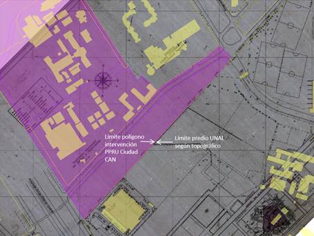 Además, revisada la planimetría del Decreto Distrital 635 de 2017 se observa que el límite del PPRU “Ciudad CAN” no presenta superposición alguna con el límite de la Universidad Nacional definido en el plano topográfico TE 13/1-00, como se observa en la imagen 5: